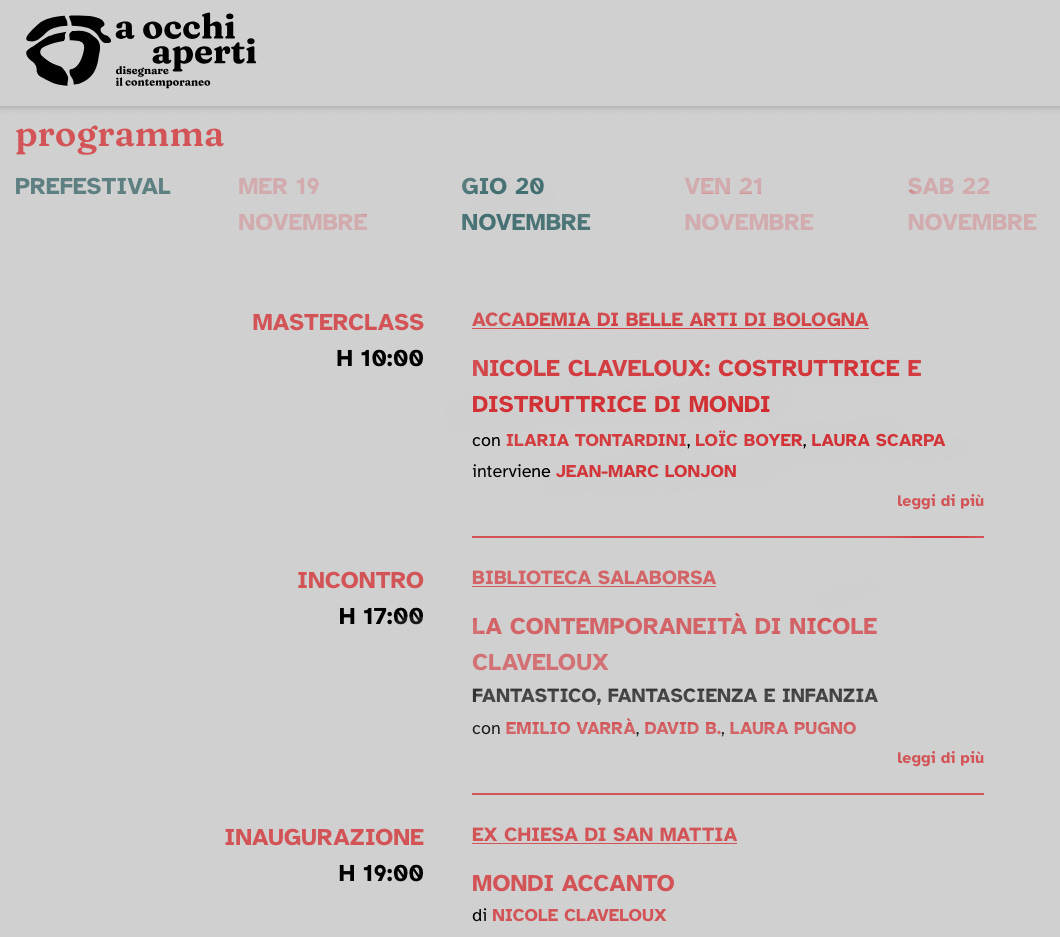 Giovedì prossimo (alle 10 all’Accademia) sarò a Bologna a parlare di Nicole Claveloux a A Occhi Aperti.